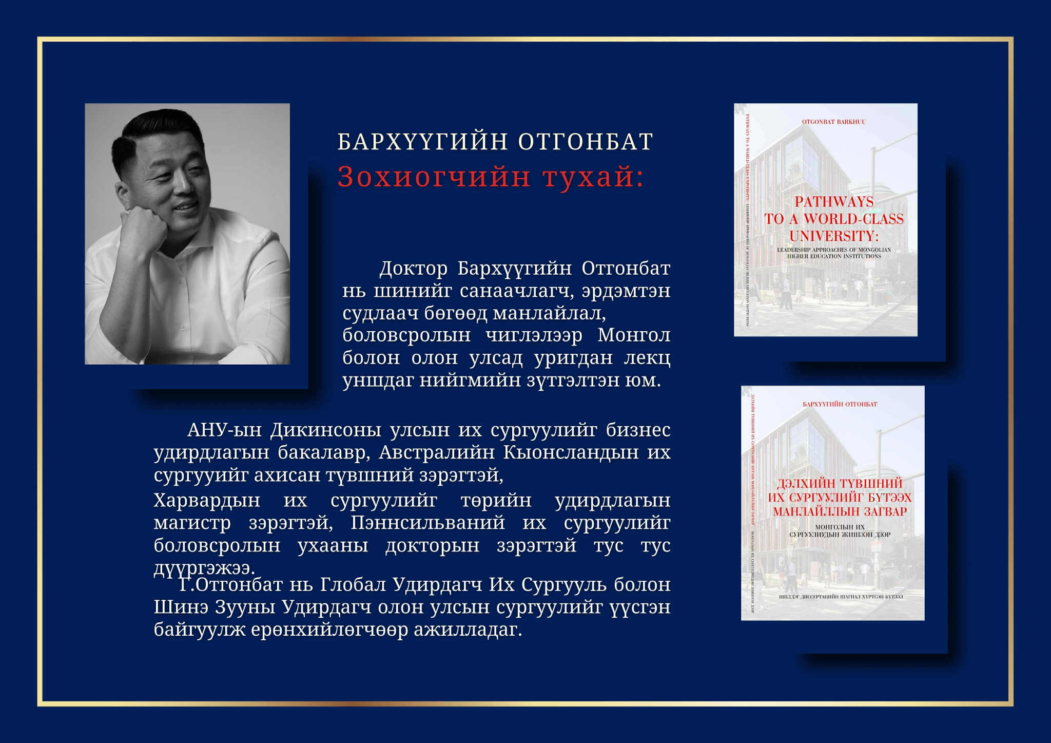 Доктор Бархүүгийн Отгонбатын ДЭЛХИЙН ТҮВШНИЙ ИХ СУРГУУЛИЙГ БҮТЭЭХ МАНЛАЙЛАЛЫН ЗАГВАР номын нээлт болно.